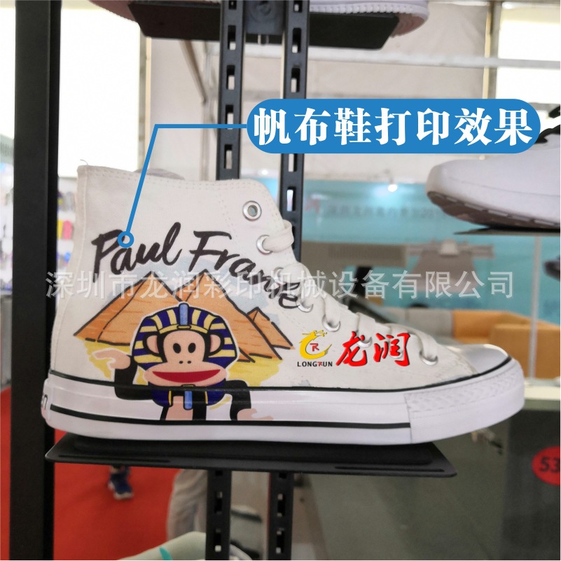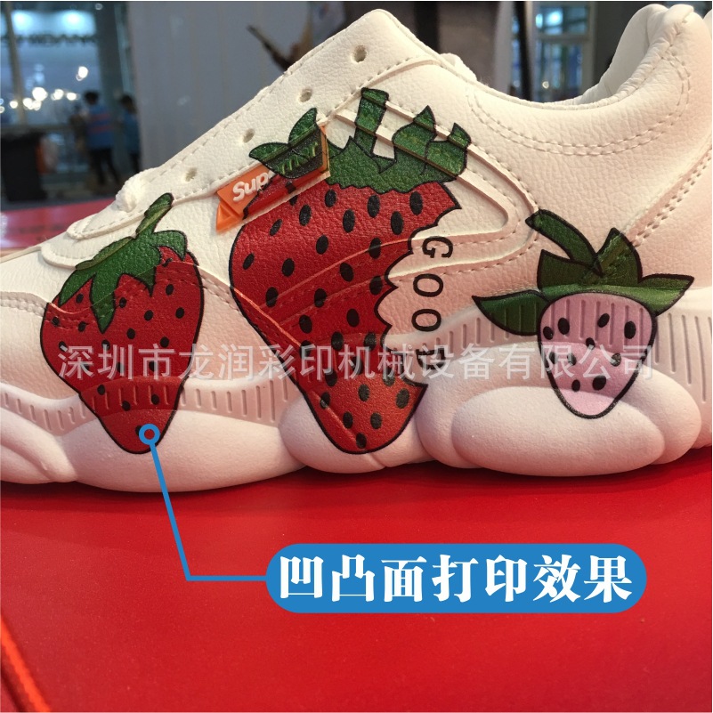 龍潤LR-2513 uv打印機實現從2.5毫米打印距離到2.5厘米打印距離的,直接打印高弧度,實現uv打印高弧面,uv打印異形,uv打印鞋面,uv打印凹凸面,uv打印玩具等高落差產品,無需制版,直接打印。2513UV高落差平板噴墨打印機是針對鞋子/鞋材行業的專用機型,其有高落差、高噴射、打印精度高、質量好、色彩鮮艷、打印速度快、圖案清晰亮麗、不掉色等特點。打印落差25mm不飛墨,打印方便,無需制版,只要有圖片,連接一臺電腦就可以直接在成品鞋或者鞋材上面印刷自己想要的3D圖案。因為設備針對不同客戶,不同行業,所以在機器配置和機器大小選購方面存在差異,價格也高低不一,客戶在購買機器前務必要咨詢銷售人員,我們才能推薦適合您的機器。